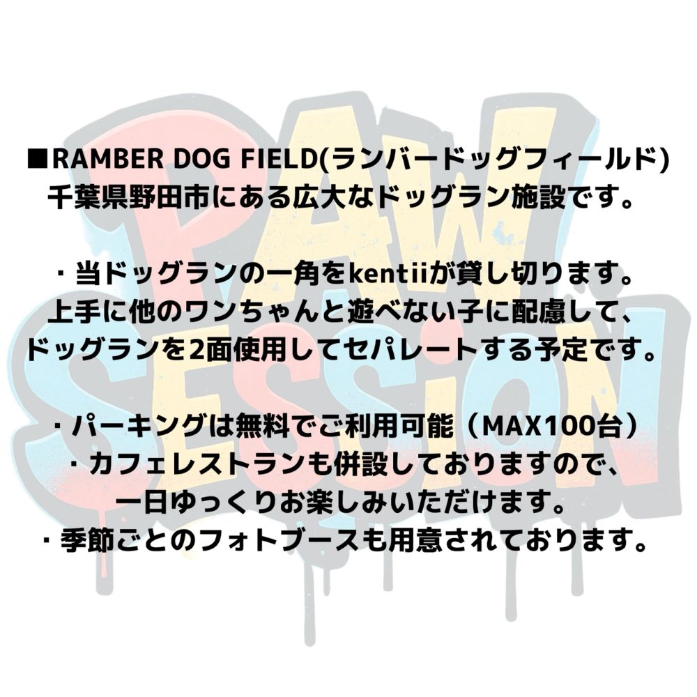 此度企画をさせていただきました。当イベントは、いわゆる出店ブースが軒を連ねるようなドッグイベントとは異なり、広大な貸し切りドッグラン施設で、飼い主様達も愛犬達も素敵な一日を過ごせるような場にしていければと考えております。